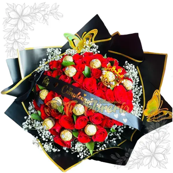 Bouquet con 30 rosas rojas, Cinta Feliz Cumpleaños, 8 Chocolates ferrero y mariposas. Color de la rosa según disponibilidad.