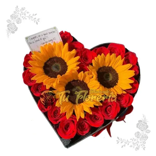 Caja Corazón color según disponibilidad, con rosas y Girasoles.