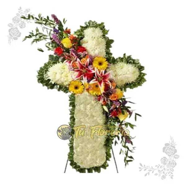 Cruz fúnebre mediano tapete blanco moño exóticos